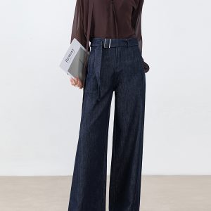 Drawstring high-waisted jeans with a relaxed, flowing drape that hugs the floor