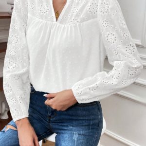 Hollow Solid Color V-Neck Lace Stitching Women’s Long Sleeve Shirt